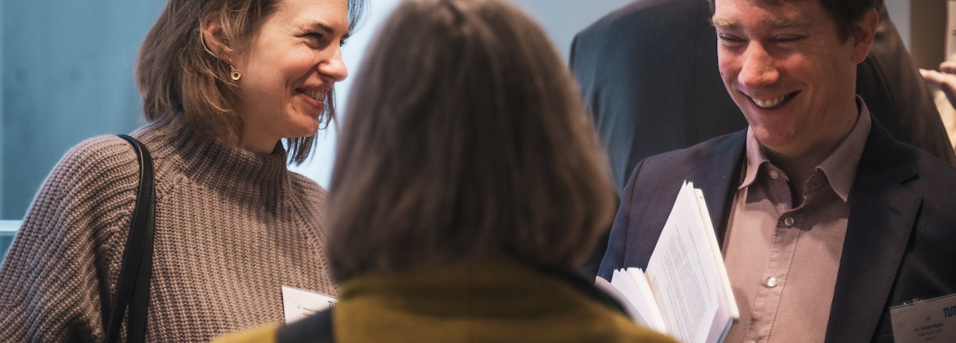 people talking to each other and smiling